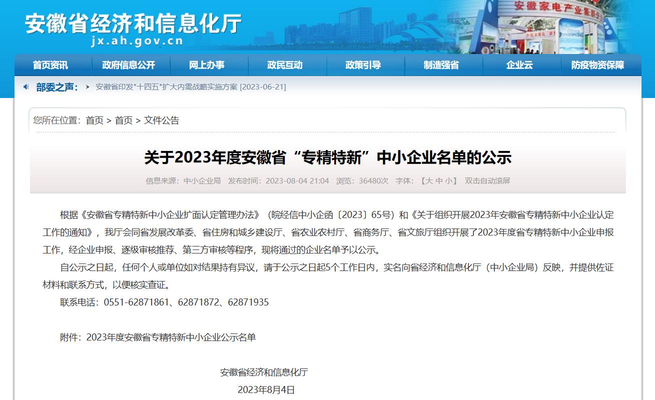 根據安徽省經濟和信息化廳發布的《關于2023年度安徽省“專精特新”中小企業名單的公示》((皖經信中小企函〔2023〕65號)),安徽創世環境科技有限公司成功入選為2023年度安徽省“專精特新”中小企業。